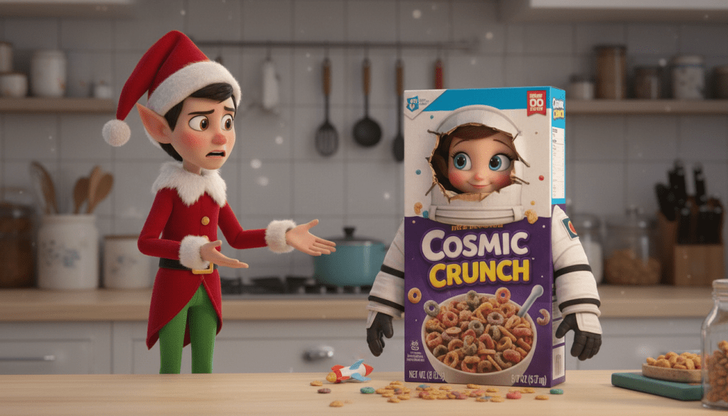 “A naughty elf switched his chocolate milk with chocolate eggnog,” she said, trying desperately not to laugh out loud. “He had three cups, and you all know that he only has eggnog after all the presents have been delivered. And even then, he only has one glass!”