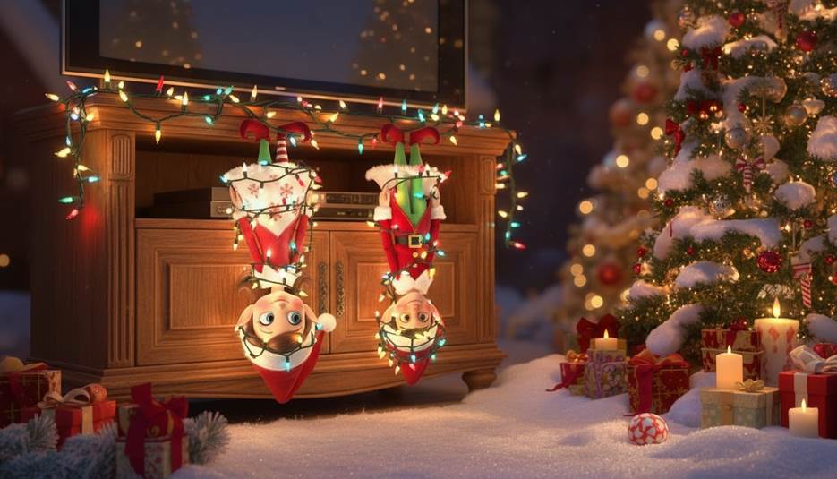 Then Nim zipped into the kitchen and pulled some tape out of the drawer. He secured Lil to the underside of the TV, adding ribbon and bells.