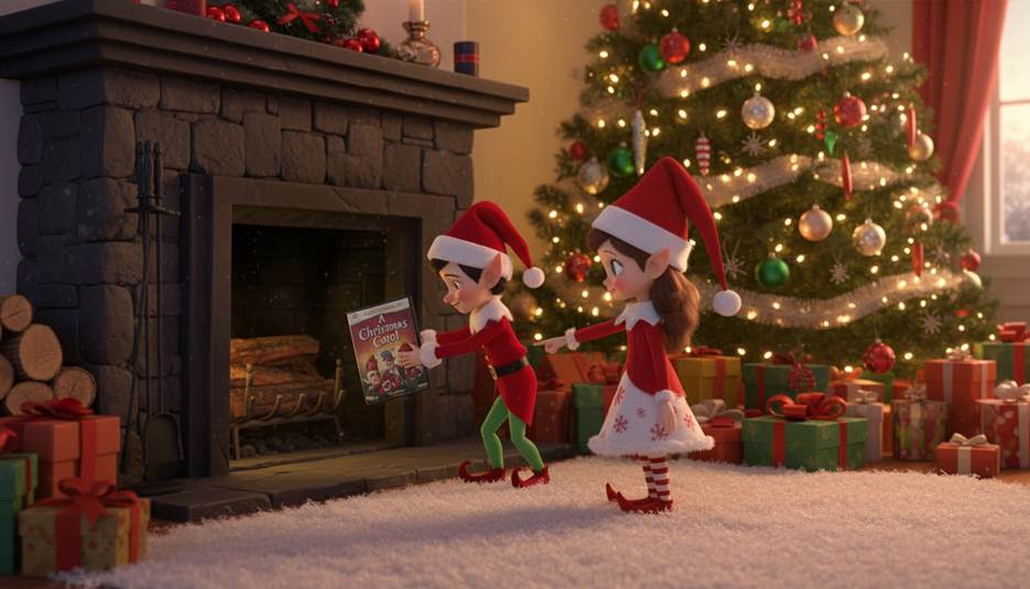 Nim and Lil were singing Christmas carols with the other scout elves as they waited for the night’s pep talk from the Big Guy.