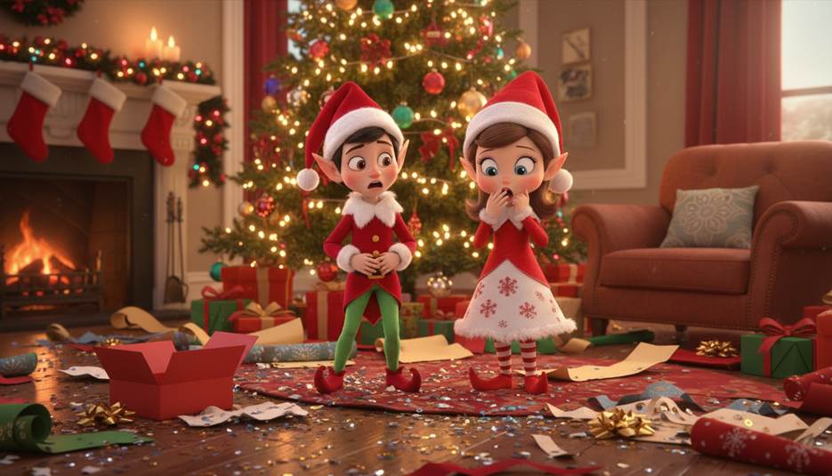 A little out of breath, the two elves stopped and hovered over the jumbled mess they had just made. Their eyes grew wide and their mouths fell open.