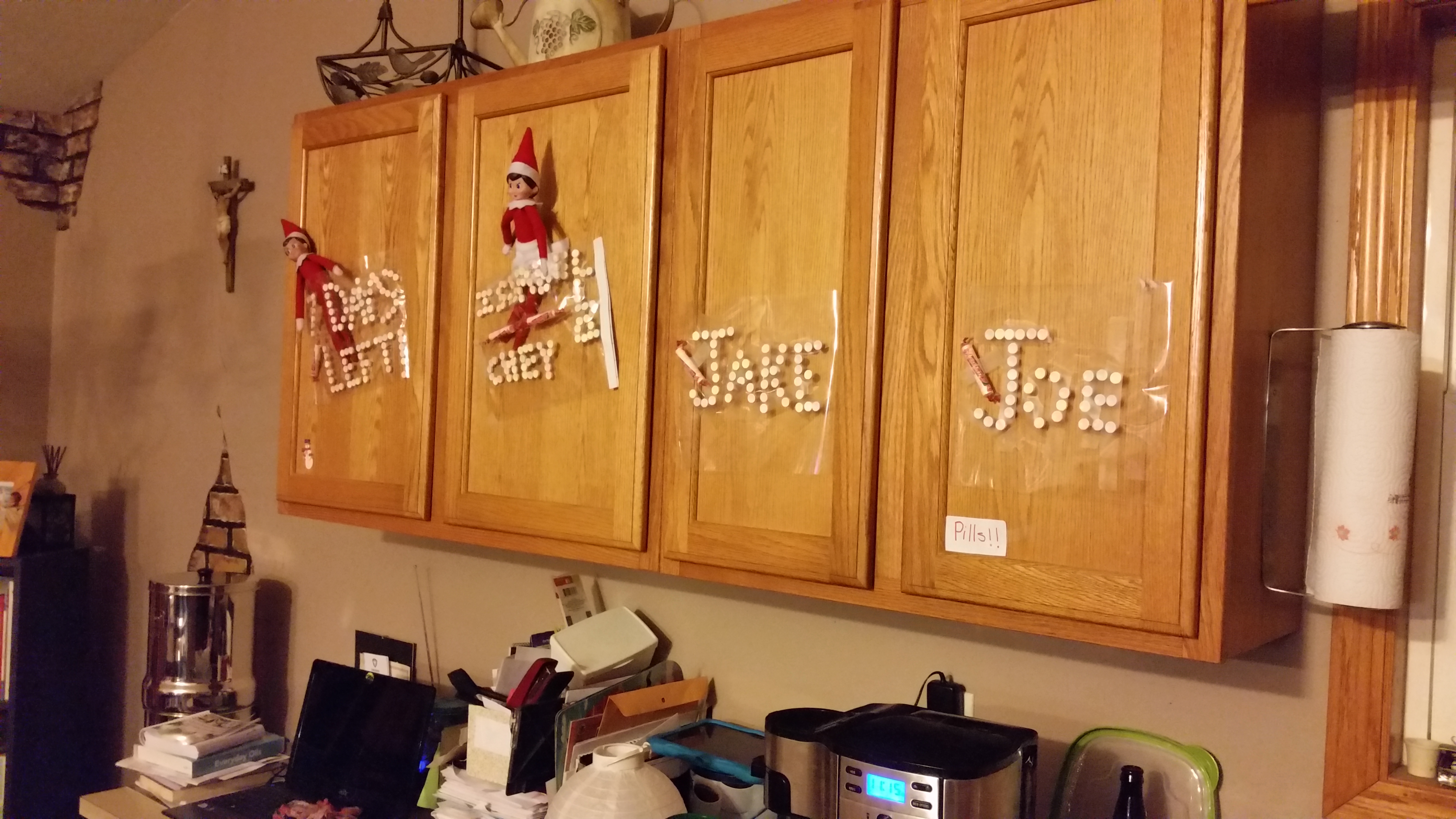 They made a medium-sized mess with the Christmas bows as they created a “bow climbing” wall on the side of the cabinets for Lil.