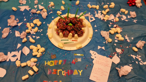 They had already spread out a tissue paper table cloth. On a paper plate in the middle sat a mountain of birthday sprinkled chocolate donut holes with 4 candles jammed in the top.