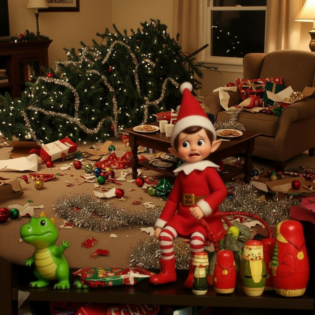 A little out of breath, the two elves stopped and hovered over the jumbled mess they had just made. Their eyes grew wide and their mouths fell open.