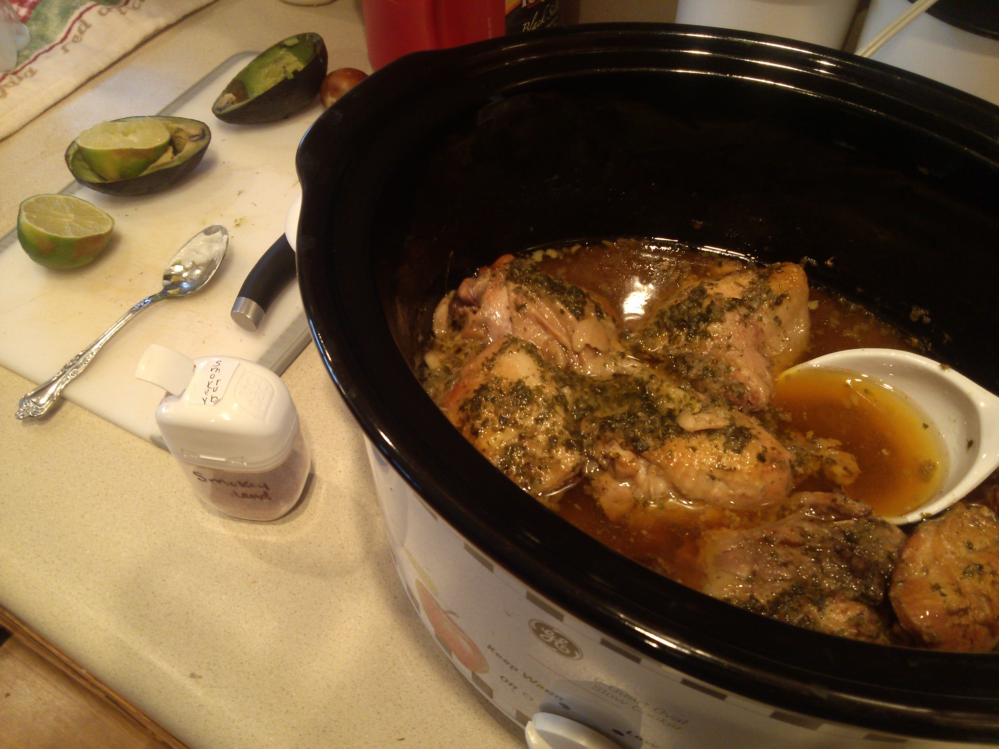 Place all ingredients in a slow cooker and cook on low for 6-8 hours until chicken falls off the bone. At that point you can take the skin off but I prefer to leave it on, just because I like the flavor.