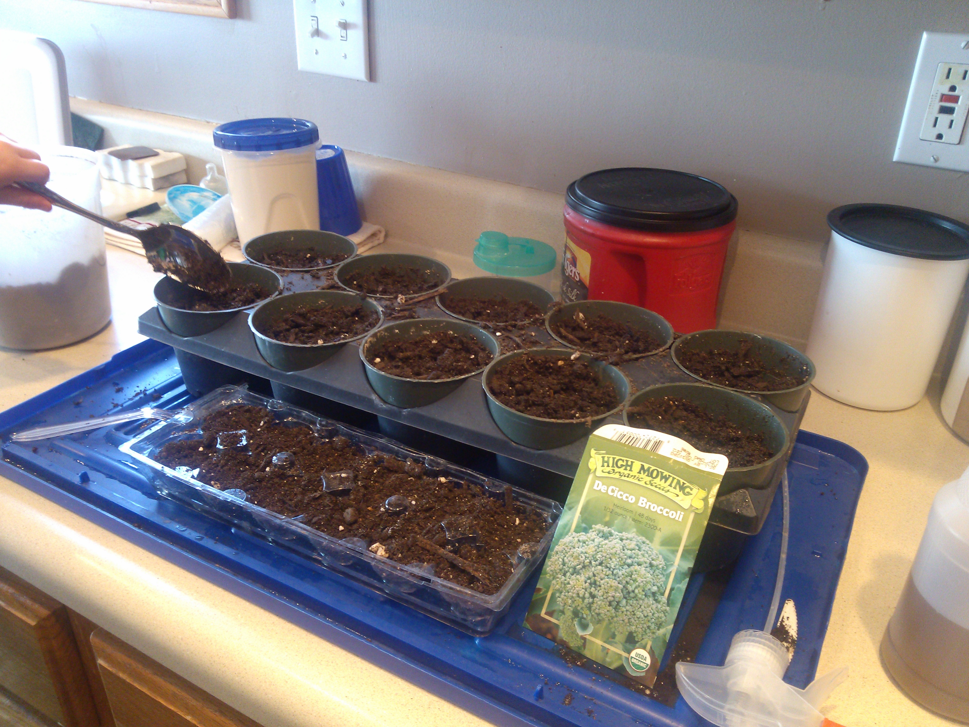 Today Joe and I started our broccoli seeds. I decided to do a little experiment. I started some of the seeds in larger pots to avoid “potting up” the seedlings later. I also started some in the egg carton that I used for the cabbage.