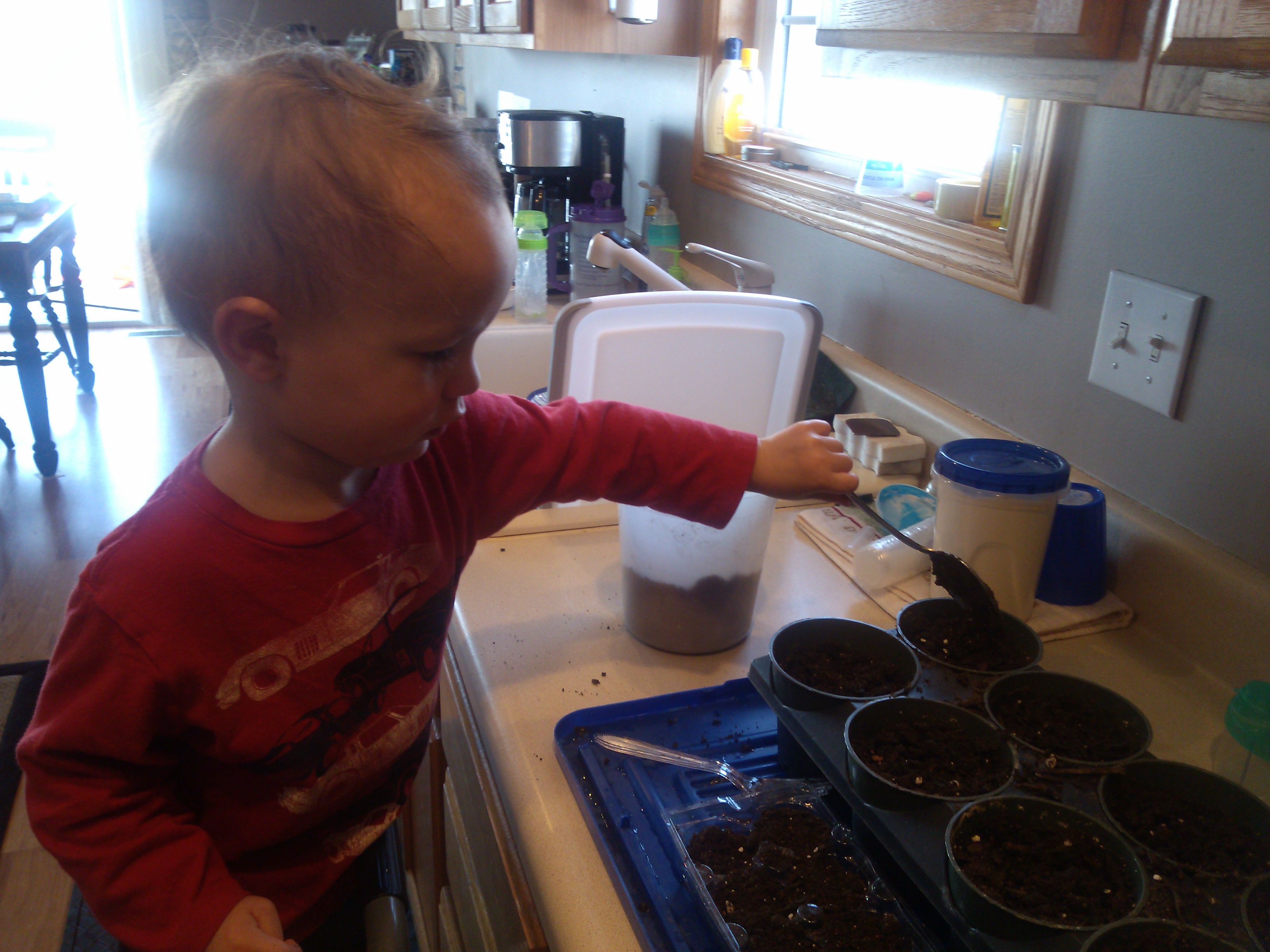 I had been saving my coffee grounds, which you can use immediately as compost, so I mixed with the potting soil at 25/75 grounds/soil. I added a tablespoon of powdered egg-shell for extra calcium…and because I’m so excited that it is fertilizer that I created! 🙂