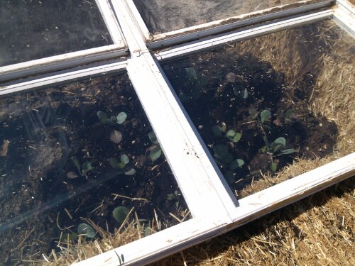 It was windy and chilly so Ray put a makeshift coldframe together over the bed. Even though cabbage is a cold hardy veggie, we want to be sure of them surviving the cold and the wind.