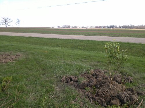 UPDATE: I forgot to mention that we took out three evergreen bushes from the front of our house and buried the remains in the holes we dug for our blueberries, planting the blueberries on top. Blueberries love acidic soil and evergreens can provide a nice acid-y environment.