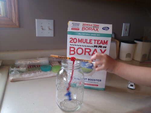 Next, hang the pipe cleaner shape in the jar making sure that the pencil rests on top of the jar and the shape is completely covered with liquid but does not touch the bottom of the jar.