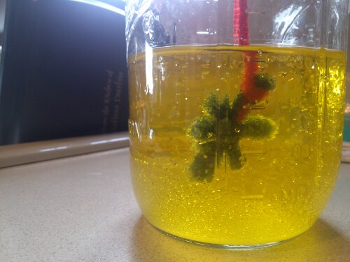 Within minutes, the borax will begin to collect on the pipe cleaner and left overnight the pipe cleaner will be completely covered in borax crystals by morning. Remove from the liquid, it only takes a few minutes to dry. Beautiful!