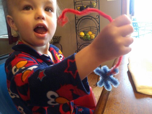 Although the science of this experiment might be a little advanced for a two year old, I explained it to him anyway…who knows, it might sink in a little bit. Here’s a link to the original recipe and “the science behind the fun”.