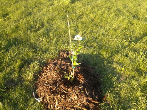 That is what we did on the east side of the driveway. On the west side we put up four 8′ posts and planted the hops. Our plan is to alternate rows so we have a row of hops, a row of kiwi, a row of hops, a row of grapes, etc. Before dark, we had just enough time to put the posts up and plant the hops and kiwi.