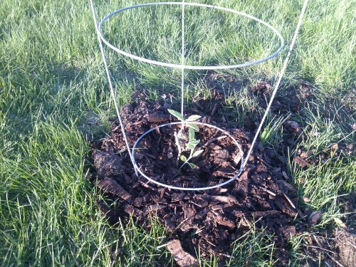 Behind the aronia, we planted autumn olive, also called autumn berry. This is quite the controversial plant. It is considered a “noxious weed” in many circles and the best kept secret in North America in others. I’m pretty sure we had these lining the back of our property in Michigan but never ate them because we thought they were poisonous. We have three plants, just starts really, so we have put tomato cages over them.
