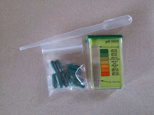 I got the above kit at Ray’s new favorite store, Big R. I followed the directions and took three separate samples: garden/tree area, hedge area and hops area.