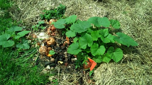 This is our compost pile and what, you may wonder, is the squash plant doing there? It grew from squash seeds we had composted. There are also a few volunteer tomatoes. Crazy!