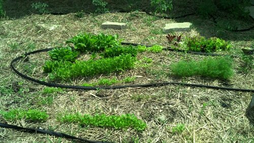 My kitchen garden, complete with cilantro, dill, chard, lettuce, spinach, parsley, basil, thyme, oregano and tomatoes. The black is a flat soaker hose I am testing out…much more cooperative than the traditional hose.