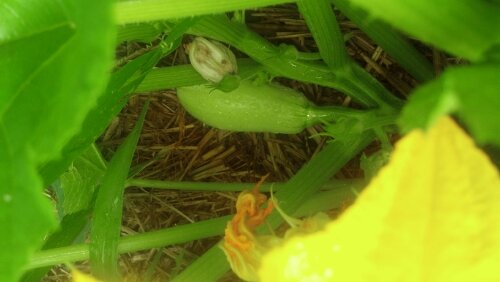 The volunteer mystery squash already has three fruit growing with the promise of more.