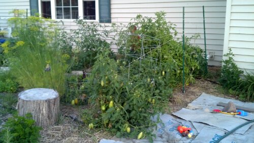 While I was away this weekend Ray put trellises up for the tomatoes. He used posts and twine. We may need to used twine instead to support the weight, we’ll see.