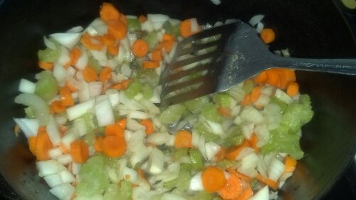 Dump the onions, celery and carrots in the pan, scraping up any pan drippings from the beef. Saute until onions are translucent and beginning to brown. Add the garlic powder and cook for an additional minute or so.