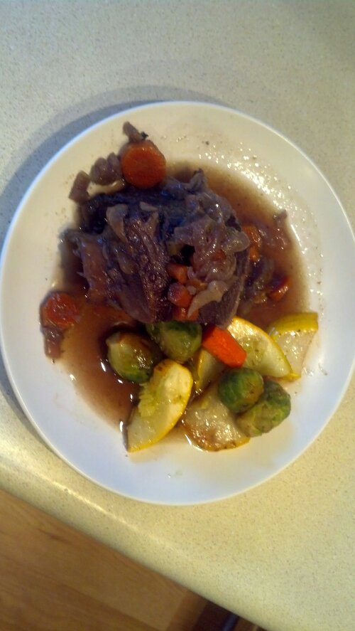 I paired the meal with roasted pattypan from my garden, brussel sprouts and carrots. The juice from the braised ribs soaked into everything on my plate. It was delicious.