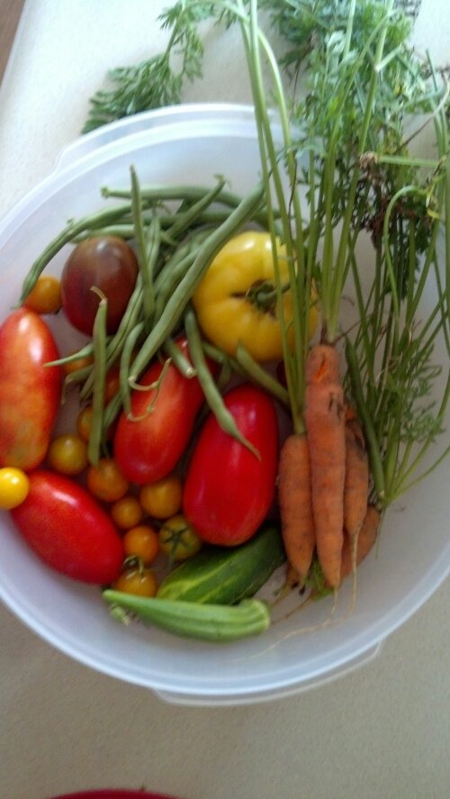 Carrots, tomatoes, cucumber, cherry tomatoes and okra. Yum!