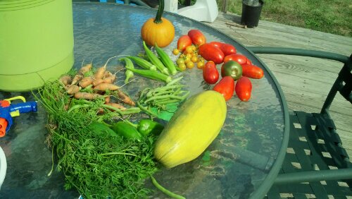 Spaghetti squash, baby pumpkin, tomatoes, okra, green beans and carrots!