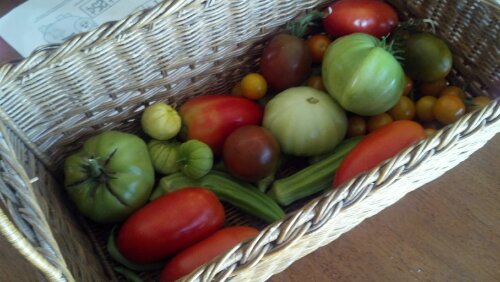 We brought in several tomatoes and tomatillos, a few gigantic okra, a few carrots and 3 green beans. That’s right, 3 green beans.