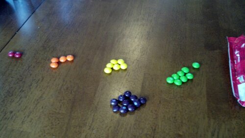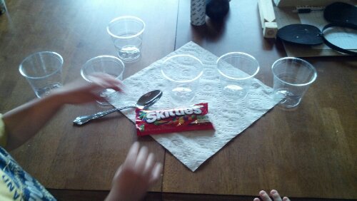 We got a bag of skittles, a spoon and six plastic cups ready.