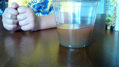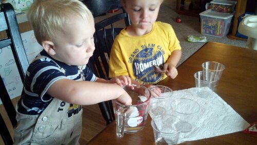 As the instructions said, we put 2TB of water in each of 5 cups. The boys had fun with this and did a great job taking turns. After a few rounds, I didn’t even have to remind them to share.