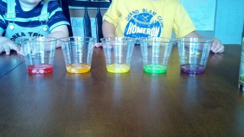 1. You really have to dissolve everything for the Skittles density rainbow. And it’s really hard to do. But it’s really worth it. You could try the Nerds alternative–I think they dissolve a little easier. (I just chose Skittles for the rainbow because it was the first candy that worked for me, and also because the rainbow colors are so close at hand.)