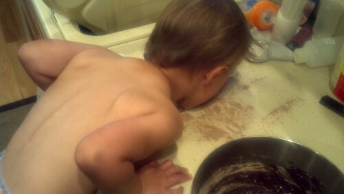 First, we mixed up the brownies and popped them in the oven. Joe spilled some of the mix…but he cleaned up after himself.