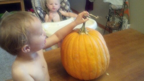 While the brownies were baking, I brought in the gigantic pumpkin we got from our neighbor’s garden. Ours are not quite ready yet.
