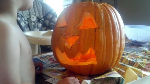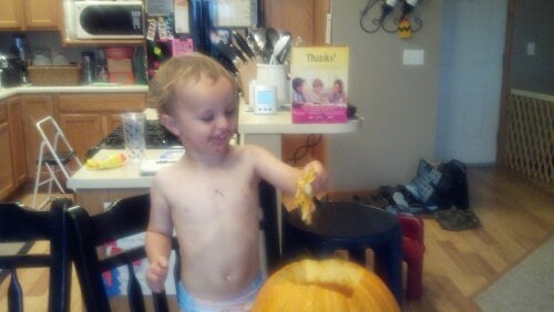 Joe had a blast pulling the guts out of the pumpkin. I, of course did the carving with Joe saying (like a broken record), “Mommy, where’s Joe’s knife?”