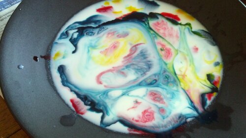 That tiny drop of dish soap starts to break down the bonds that hold the proteins and fats in the milk. The watery part of the soap dissolves in water, and the sudsy-soapy part attaches to the fat globs in the milk. As the fat globs bend and twist, twirling the colors all around the milk, the sudsy bits race around trying to catch up…bending the colors every which way and making a pretty rainbow explosion on the plate.
