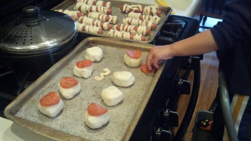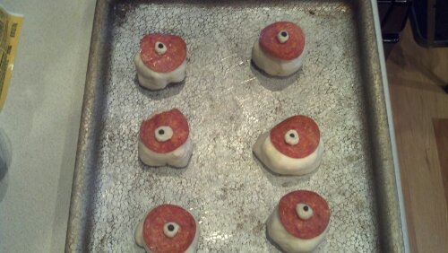 I had a tube of biscuits left, so I cut up some pepper jack cheese and grabbed a leftover pack of pepperoni out of the fridge. I made pizza eyeballs and used a tiny rolled up piece of biscuit for the center of the eye with a black peppercorn smack on the middle.