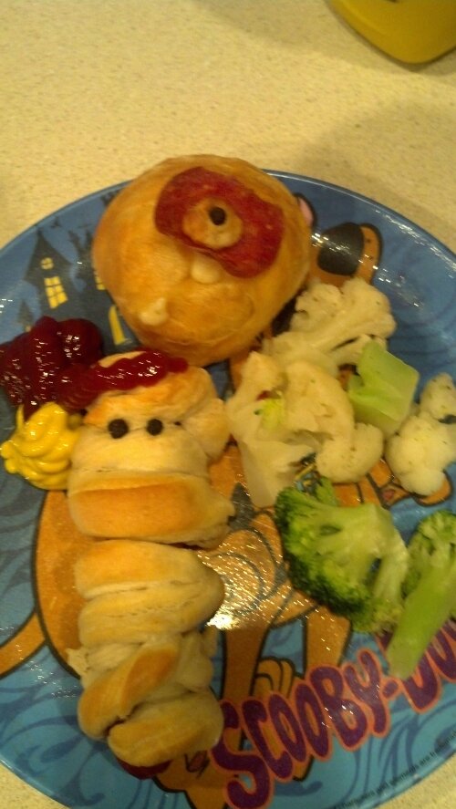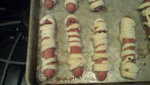 In honor of Halloween, the kids and I made mummies and eyeballs for dinner.