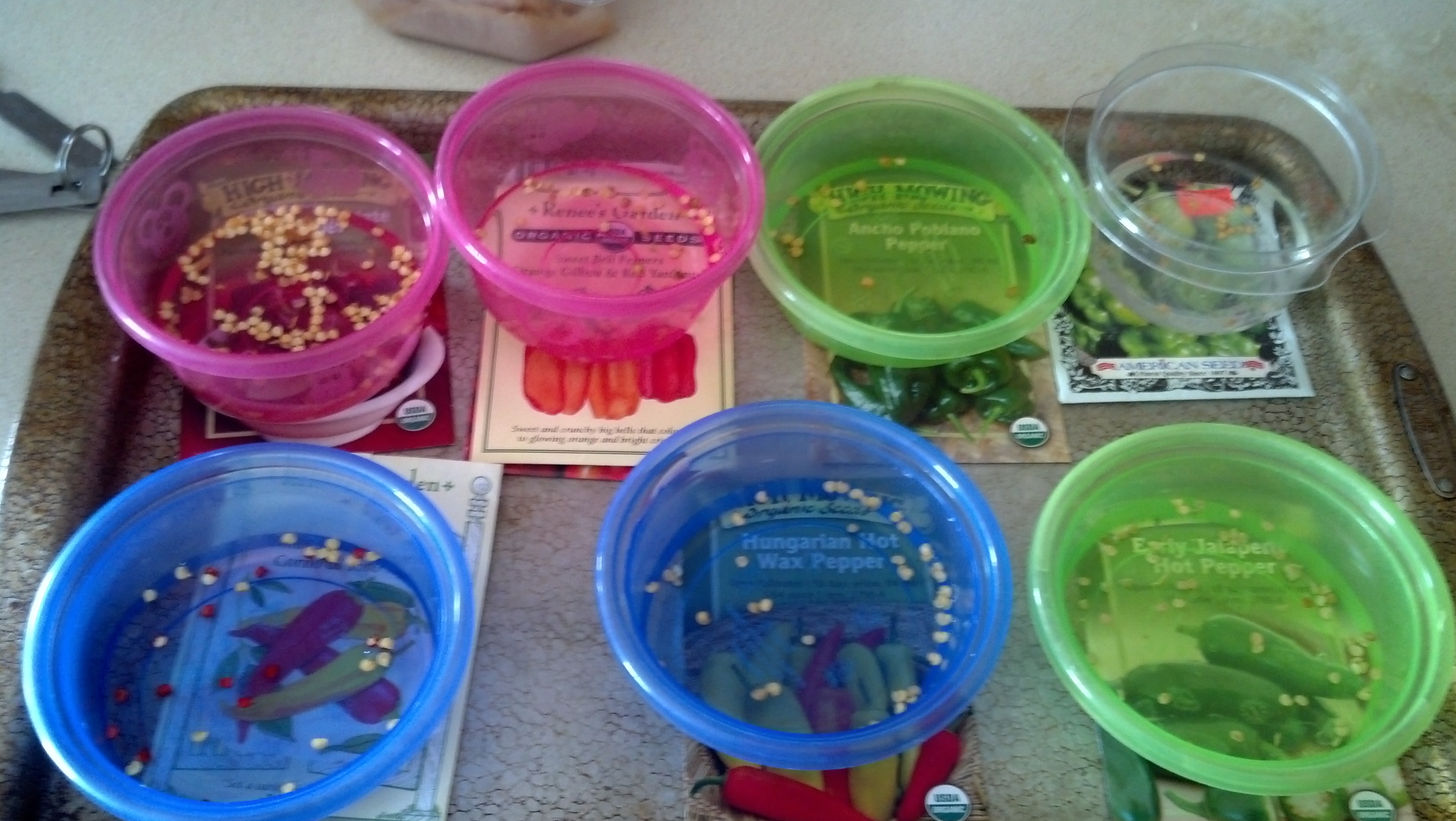 For the peppers, I followed instructions from davesgarden.com. As I mentioned above, I had poor luck with my peppers and tomatoes last year and I’m determined to get a better yield this year. I had not heard the recommendation to soak the seeds prior to starting them so I gave that a try this year.