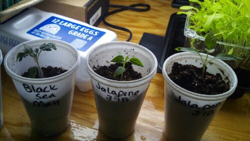 Since transplanting the peppers, tomatoes and cabbage into the small clear plastic cups, I have lost 5–1 cabbage and 4 jalapenos. However, most of the others, especially the black sea man tomato and the cabbage, are thriving.
