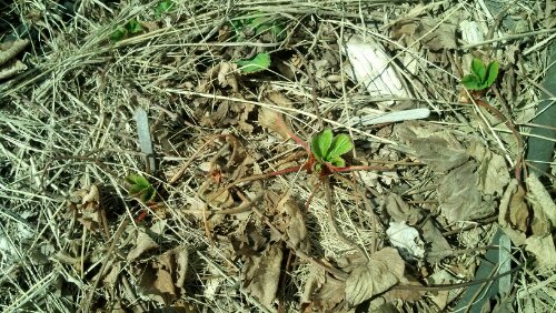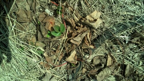 Over the weekend, we were outside with the pullets letting them get some much needed exercise. I walked around and checked on all of our beds and was surprised to see the strawberries waking up. Little and big leaves were running through the beds!