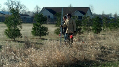 At the start of the day we were looking at a plan to put three swales in. Once we actually started measuring, the number went up to five. We were able to clearly determine the contour lines of two but, with all the irregular dips and dives of our land, the other three seemed to change every time we used the stadia.