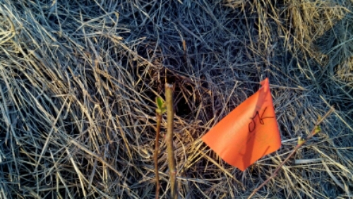 Next are the nanking cherry trees we planted in the south swale. They had a few sprigs on them when we planted them, but they have even more vibrant green leaves now.
