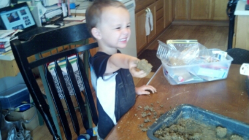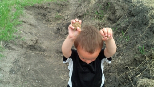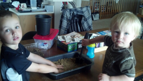 There they are. My two little bombardiers making seed bombs to launch in the swales. This is serious business.