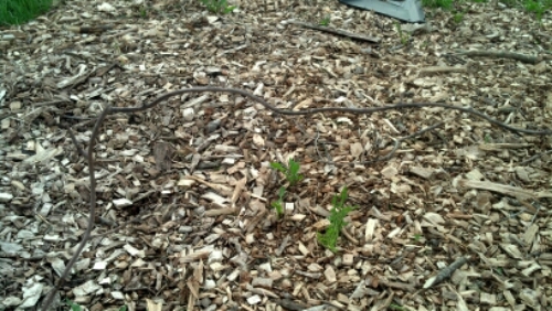 Grass and weeds are starting to overtake the wood chips. That’s what we get for not putting cardboard down before mulching.