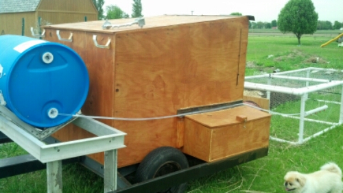 Ray finished mounting the automatic watering system on the coop yesterday. All that is left to do is attach the gutter to catch rainfall that will feed into the bucket and install the indoor waterer. Next up for the chickens is to install the venting as well as set up the automatic feeding system.