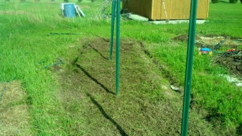 Ray used the new ultra-powerful gas weed eater on the bean trench area. We fixed one of the posts and roughed up the ground a bit. Then I threw down some wildflowers and coneflowers and covered with a thin layer of mulch. I’ll be planting the beans in the trenches soon as well.