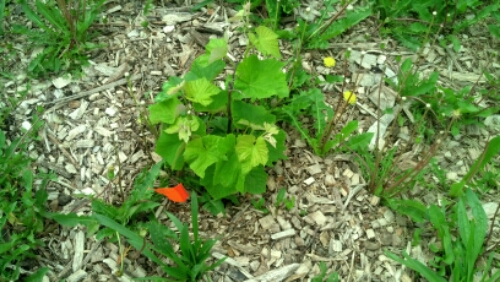 This little gem is growing in one of the woody beds. It’s in the same spot that we got the volunteer pumpkins last year so I’m thinking that is what we have here.