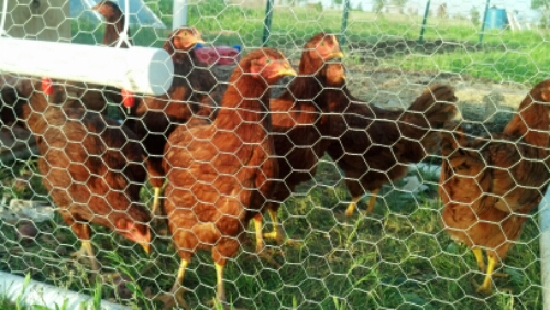 We repurposed two thin and light plastic mats that came with a garden cart we got last year. As soon as we started zip tying the mats to the top of the playpen, the chickens were out clucking. “Now what are you doing to our playpen? Yes, I speak chicken now.