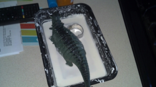 First up, we made some indoor goop and used cookie cutters, dinosaurs, cars and anything else we could think of to make impressions and watch as they quickly disappeared. The boys did this for about 30 minutes and had a blast.
