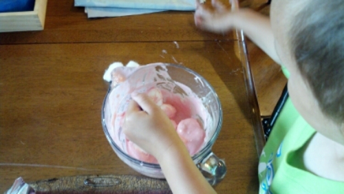 First you mix equal parts flour and water and add food coloring to your liking. We used red.