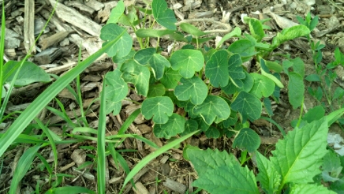 I thought this was creeping myrtle but it does not look like the pictures I have found so I’m not sure what it is. I didn’t know that it flowered until this year, and, if it wasn’t trying to strangle my strawberries and roses, I might let it be.